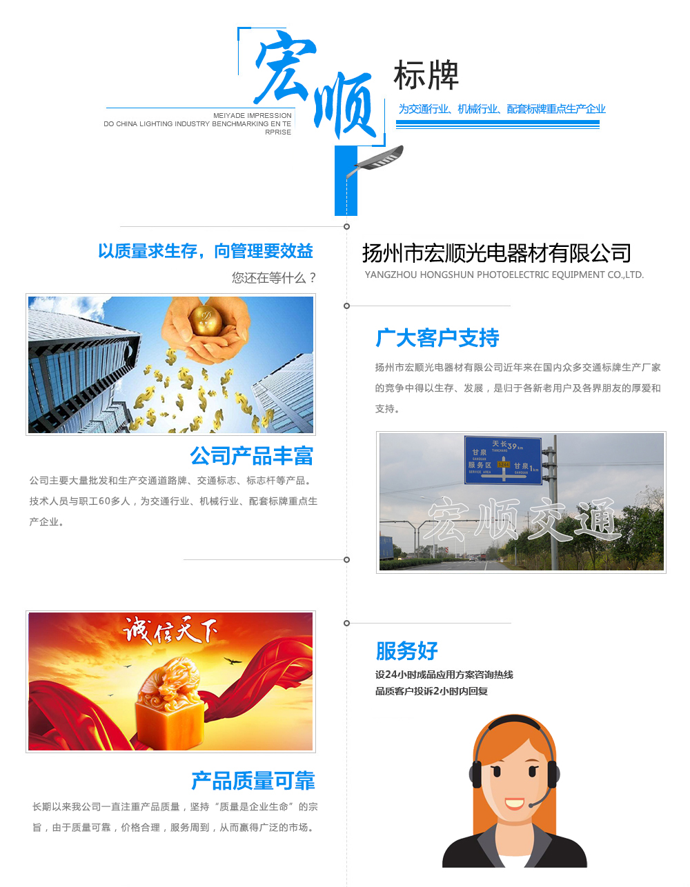 揚(yáng)州市宏順光電器材有限公司近年來在國內(nèi)眾多交通標(biāo)牌生產(chǎn)廠家的競爭中得以生存、發(fā)展,是歸于各新老用戶及各界朋友的厚愛和支持。我們?nèi)w員工向你們致以誠摯的感謝。 為使我們共同步入新世紀(jì),提高我們的產(chǎn)品質(zhì)量與服務(wù)希望對(duì)我們提出寶貴的意見,使我們不斷改進(jìn)、創(chuàng)新。 我們將和過去一樣,視今天的質(zhì)量為明天的市場。為您奉獻(xiàn)滿意的各種精品,為美化我們的交通事業(yè)做出貢獻(xiàn)。 公司主要大量批發(fā)和生產(chǎn)道路交通標(biāo)志牌、道路指示牌、交通標(biāo)志牌、指路牌、反光標(biāo)志牌等產(chǎn)品。技術(shù)人員與職工60多人,為交通行業(yè)、機(jī)械行業(yè)、配套標(biāo)牌重點(diǎn)生產(chǎn)企業(yè)。 長期以來我公司一直注重產(chǎn)品質(zhì)量,堅(jiān)持“質(zhì)量是企業(yè)生命”的宗旨,由于質(zhì)量可靠,價(jià)格合理,服務(wù)周到,從而贏得廣泛的市場,近年來隨著交通事業(yè)的開發(fā)和研究,傾聽用戶的意見,使得我們?cè)谑袌龈偁幹胁粩喟l(fā)展壯大。 我們本著“質(zhì)量可靠、信譽(yù)優(yōu)先、用戶至上”的宗旨,“以質(zhì)量求生存,向管理要效益”的信條,竭誠為... ...【查看更多】